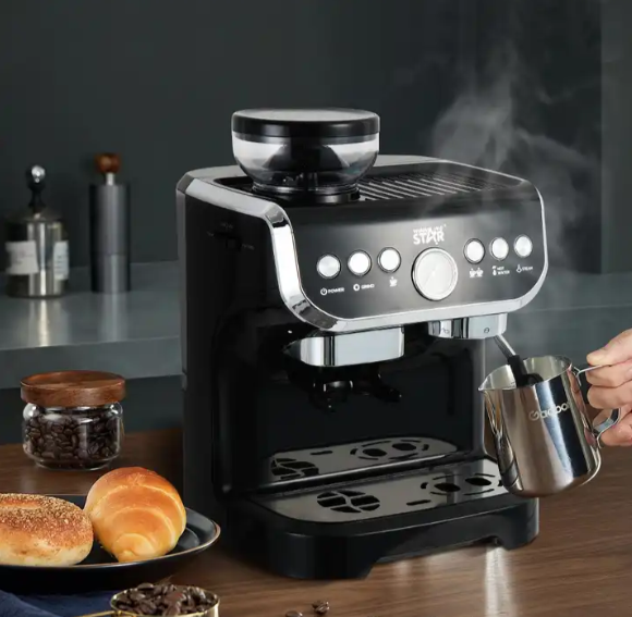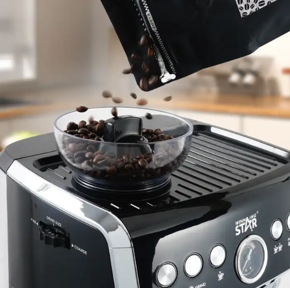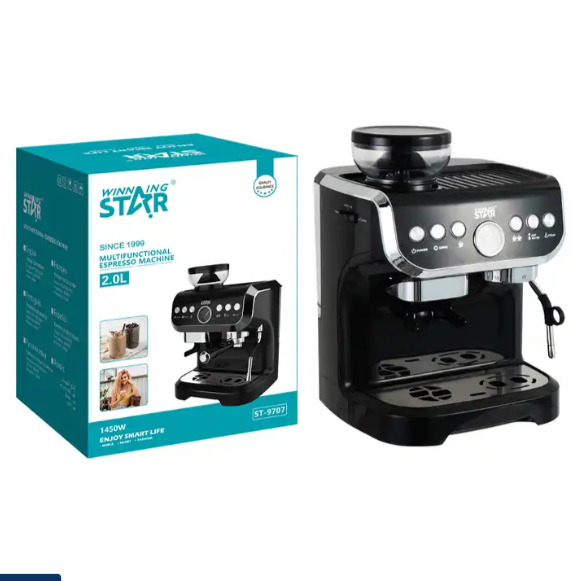 ST-9707 New Arrival WINNING STAR 1450W Espresso Machine Coffee Maker with 150W Grinder 15 Bar Pump Pressure Milk Foaming Steam Wand Pressure Gage 2L Detachable Water Tank Customize Coffee Volume 1.15m Copper Charging Cable BS Plug